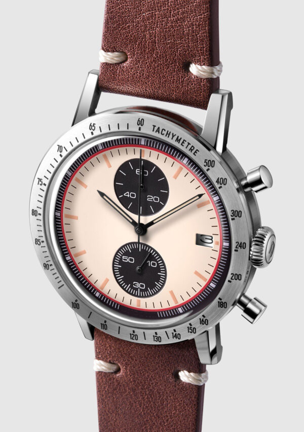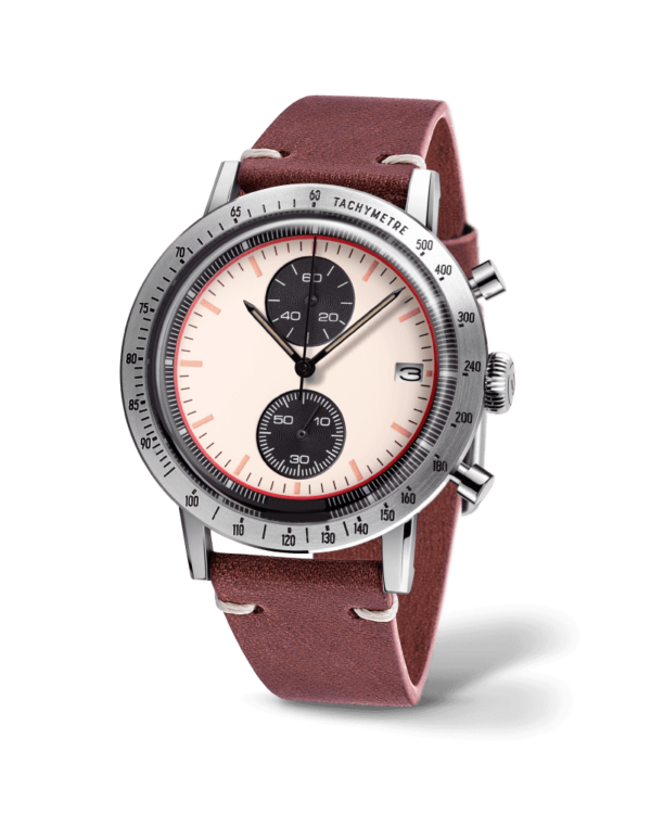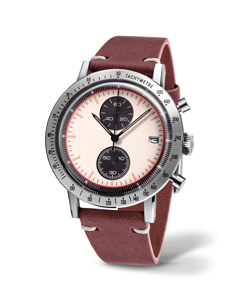 Chronograph watch with tachymeter, stainless steel case with 2 pushers, tachymeter bezel and genuine leather strap.
